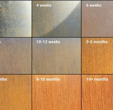 Po 10 mėnesių ir daugiau: Patina įgauna galutinį atspalvį – gilų, natūralų rūdžių toną, kuris nebekinta taip ryškiai. Paviršius tampa vienodas ir ilgaamžis.