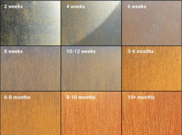 Corten plieno patinos pokyčiai: nuo 2 savaičių iki 10 mėnesių